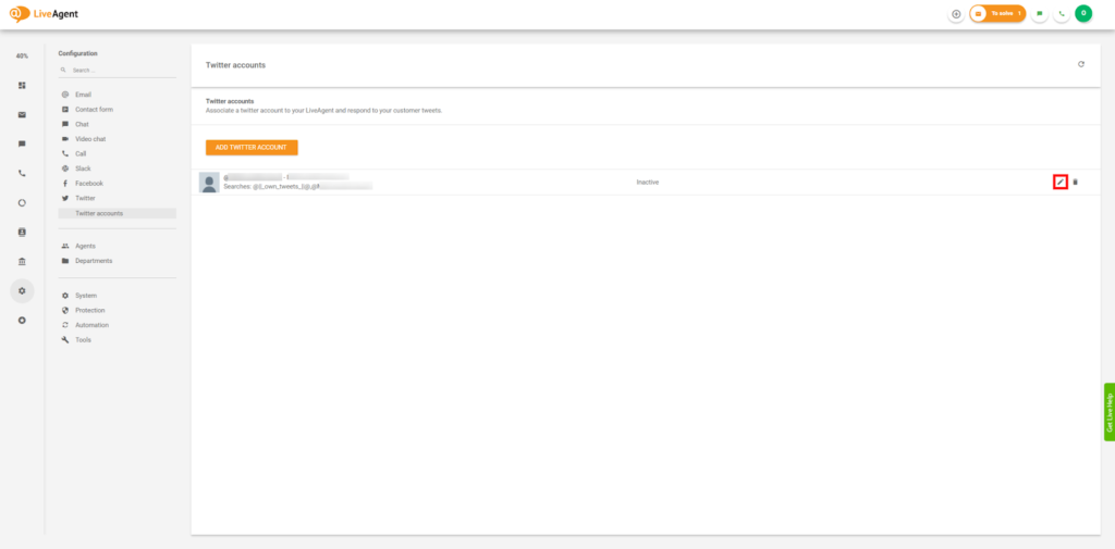 - Sobald Ihr LiveAgent-Konto mit Twitter verbunden ist, können Sie auf Bearbeiten klicken, um Ihr Konto zu aktivieren