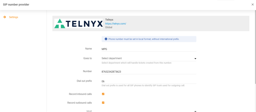 Gehen Sie einfach auf Konfigurationen > Aufruf > Nummern > Telnyx. Fügen Sie die VoIP-Nummer hinzu und verwenden Sie sie sofort.