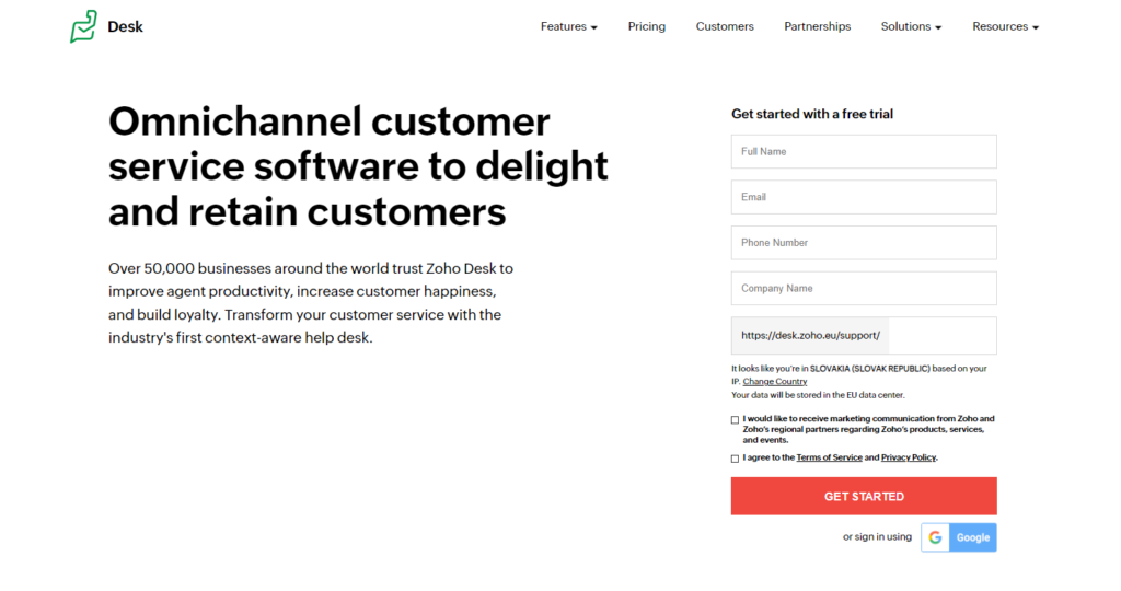 Zoho Desk unterstützt Kundendienstteams und Vertriebsmitarbeiter als Customer-Experience-Software. Es bietet auch eine Buchungsplattform, um Kunden bei der Terminvereinbarung zu unterstützen.