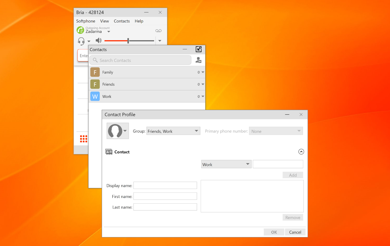 Das Erstellen eines neuen Kontakts bietet einige Optionen: Anzeigename, Vorname, Nachname und ein Feld zum Speichern von Nummern und Adressen: eine Softphone-Nummer, eine Arbeitsnummer, eine Privatnummer, eine E-Mail-Adresse, eine Website und die Option „Andere“, wo Benutzer können benutzerdefinierte Daten eingeben. Es gibt keine Option, die es Benutzern ermöglichen würde, einen Kommentar oder eine einfache Notiz in die Kontaktdaten zu schreiben, was ein weiterer Nachteil von Brias Kontaktliste ist.