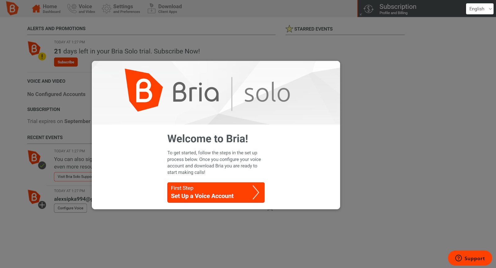 Der Prozess beginnt mit der Erstellung eines neuen Kontos auf der Bria-Website. Ich begann damit, zuerst eine Testversion zu erstellen. Ich habe die Bria Solo-Studie zum Zwecke dieser Überprüfung ausgewählt. Es dauert nur ein paar Minuten, und die Website hat mich nicht gezwungen, eine Zahlungsmethode auszuwählen oder Kreditkarteninformationen hinzuzufügen. Nachdem ich meine Daten angegeben hatte, wurde ich in meinem Konto mit einer einfachen Nachricht begrüßt, die mir sagte, was als nächstes zu tun ist.